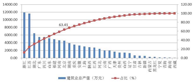 除浙江、江蘇兩省外,總產(chǎn)值超過4000億元的還有湖北、廣東、四川、山東、福建、河南和北京共7個地區(qū),上述9省市完成的建筑業(yè)總產(chǎn)值占全國建筑業(yè)總產(chǎn)值的63.41%。