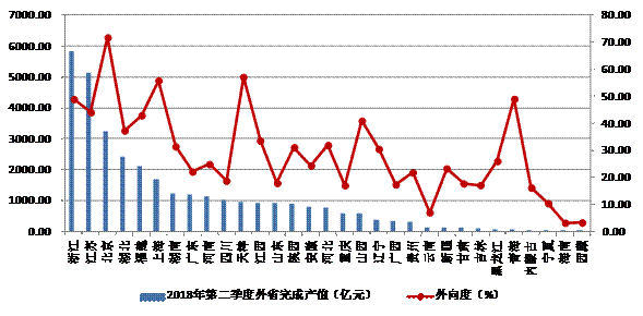 圖4 2018年上半年各地區(qū)跨省完成的建筑業(yè)總產(chǎn)值及外向度